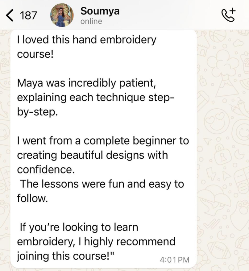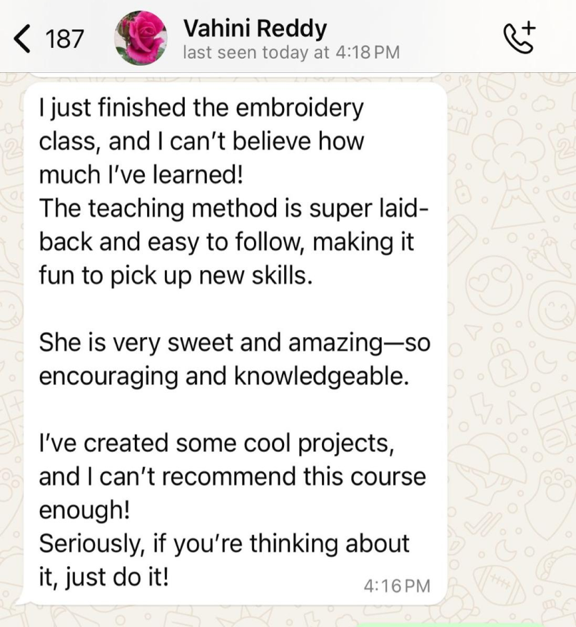 Expert Guidance: Personalized feedback from an experienced embroiderer with decades of experience.